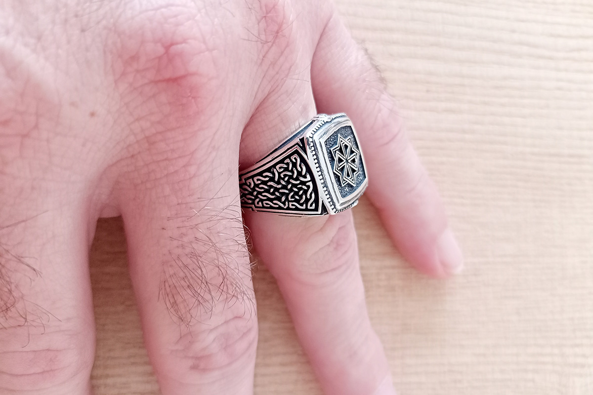 Кольцо с руническим компасом Вегвизир и рунами Тейваз (Тюр) - Путь Воина
